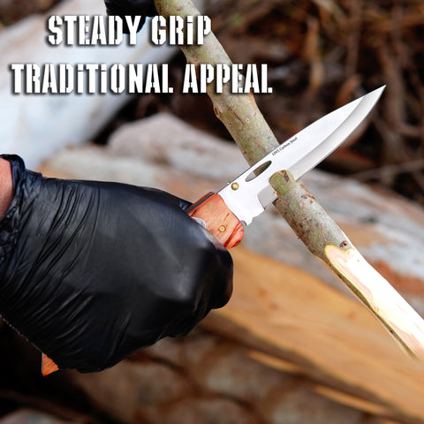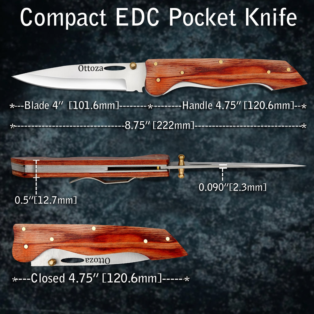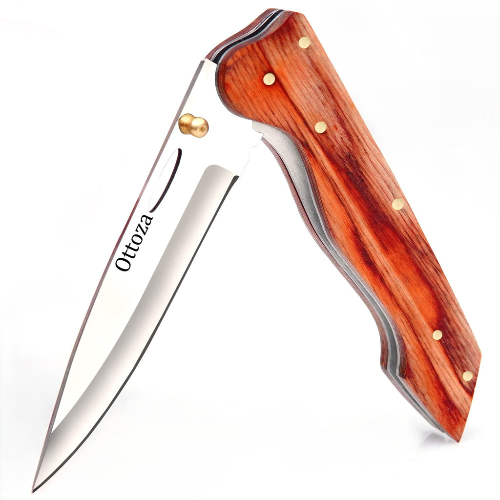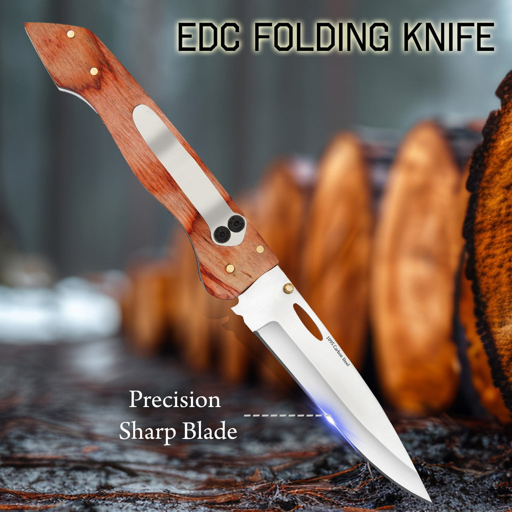 WOOD HANDLE - TRADITIONAL LOOK & COMFORTABLE GRIP The natural brown wood handle offers a classic feel and comfortable grip for extended use. A great choice for those who prefer a traditional pocket knife style with a more premium appearance.
